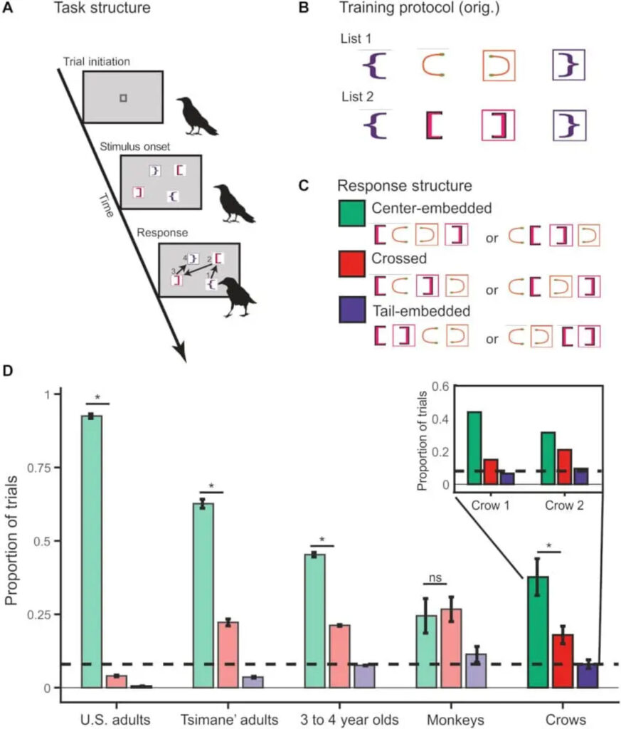 A) Treningsprosedyre. (B) Symbolpar brukt i trening. (C) Hovedresponstyper fremkalt. (D) Andel responstyper produsert av kråker (i mettede farger) sammenlignet med amerikanske voksne, Tsimane-voksne, amerikanske barn og aper som rapportert av Ferrigno et al., Science Advances (2020). © D. Liao et al.