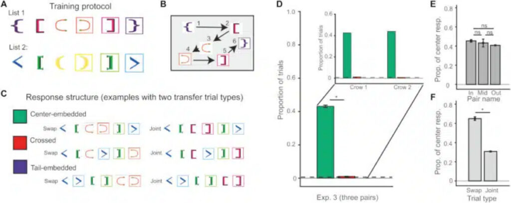 Forskere ved Universitetet i Tübingen har nå gjentatt en lignende test på ravner, kjent for sin kognitive kompleksitet og avanserte verktøybruk. Fuglene ble belønnet for å nippe på symboler i riktig rekkefølge, først med kjente par som { ( ) } og { [ ] }. Da de ble stilt overfor nye kombinasjoner – for eksempel ( ) sammen med [ ] – laget ravnene rekursive sekvenser rundt 40 prosent av gangene. Dette er betydelig bedre enn tilfeldigheter og på nivå med det man ser hos små barn, uten at ravnene trengte ekstra trening (Liao et al., 2025).